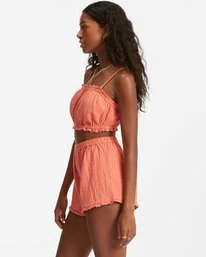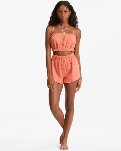 No place you’d rather be, and no better top to be inβ the Golden Daze By The Beach cropped top features a straight neck with ruffled edges, plus removable straps to customize your shape. The double-gauze cotton fabric keeps them feeling lightweight and comfortable, from shore to street.