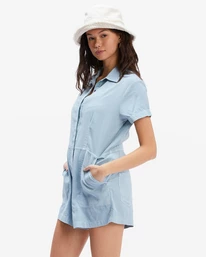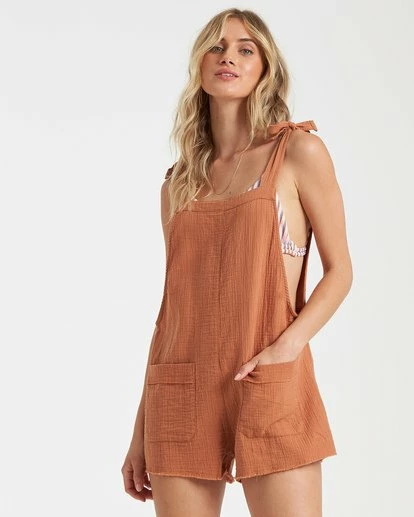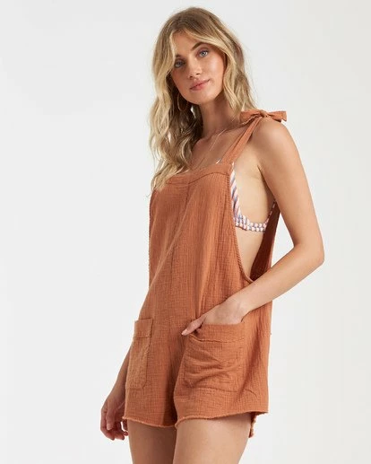 Girls just wanna have sun. It’s all good vibes and girly trims in this relaxed romper overall, trimmed with knotted ties at the shoulders and deep cuts. Easy to toss over swim or a fitted tee, the Girl On The Run Overalls keep the mood, and the fabric, light with a pucker gauze, finished with patch pockets, a raw hem and deep V cut at the back.