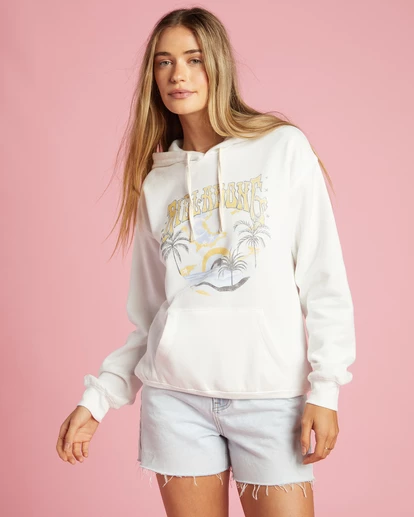 Made of soft blended cotton with a fleece feel, explore your seaside paradise in this women’s hoodie sweatshirt featuring screen-printed graphics on the back and left chest, a kangaroo pouch pocket, and a garment dye to give it a perfectly lived-in look.