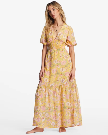 Made of recycled voile-blend fabric with a soft and sheer feel, this floral maxi dress has puff sleeves, a ruffled skirt, and a smocked waistband to define your shape.
